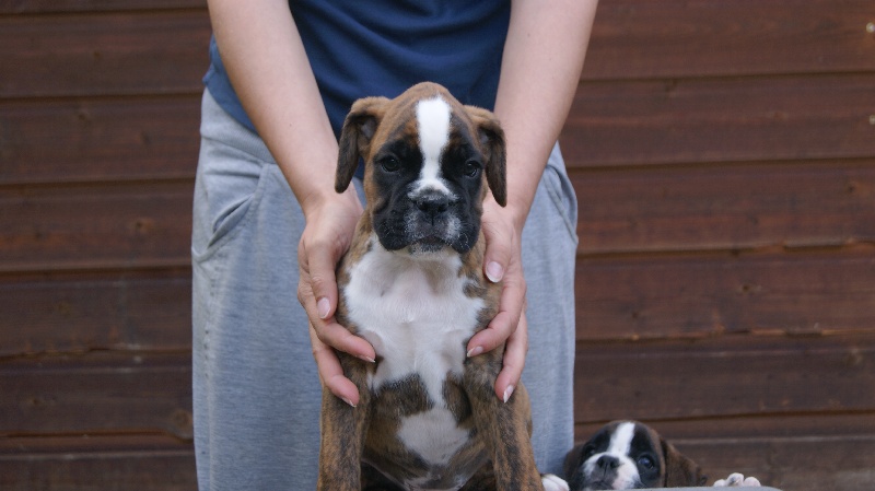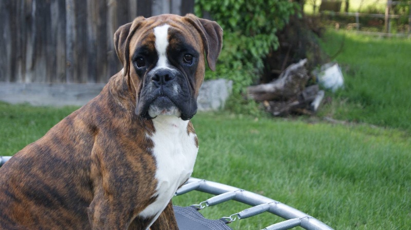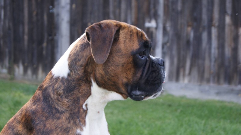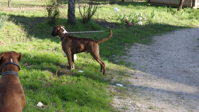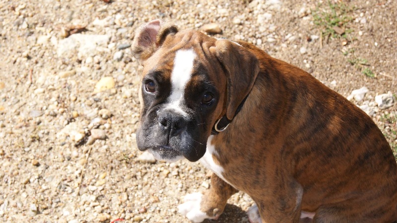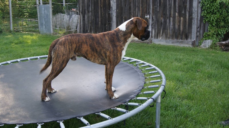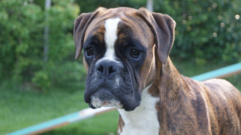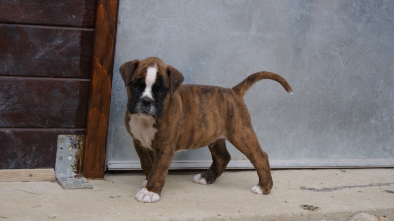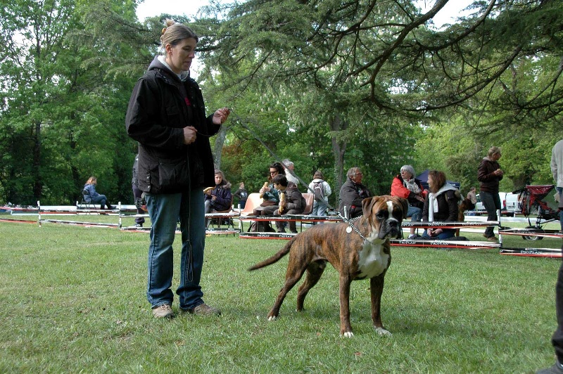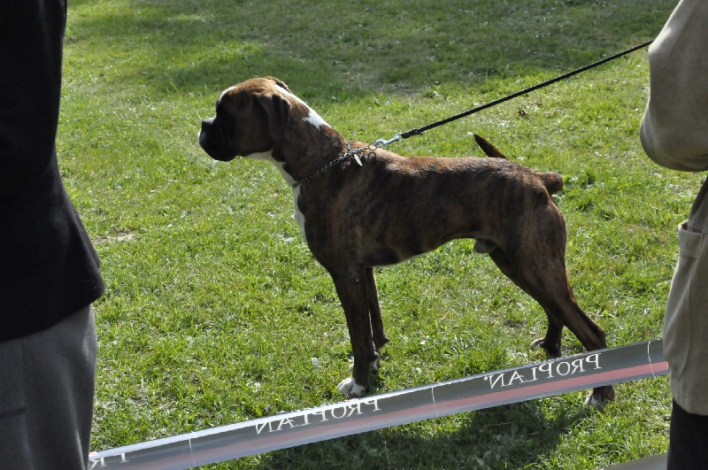 10 mois.Bringé doré marqué en blanc. trés bon type de tete,trés bon forme et couleur des yeux,le museau pourrait etre + volumineux,denture moyennement large.bon poitrail. Construction presque carré,poitrine juste aux coudes.légère dépression dérriére le garrot.trés bonne angulations avant/arriére. Allures contenues,le dos doit s'affermir